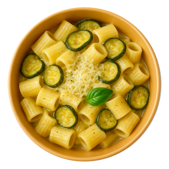 Mezze maniche with provolone and parmigiano cheese, zucchini and basil