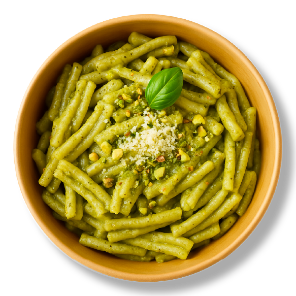 Caserecce with pistachio pesto, parmigiano cheese and basil